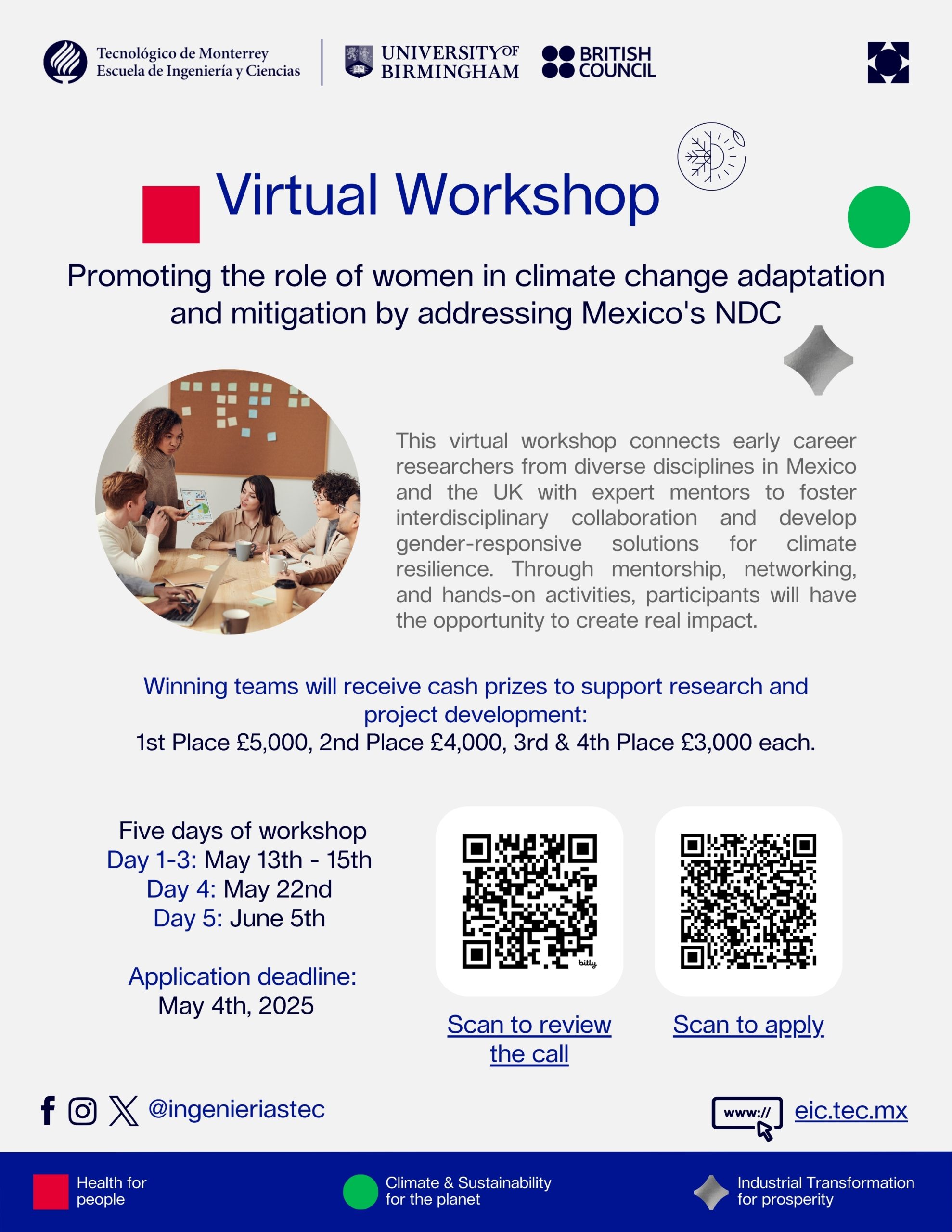 Este año, el British Council se ha asociado con la Universidad de Birmingham y el Tecnológico de Monterrey para llevar a cabo un proyecto colaborativo de Research Challenges, con el objetivo de promover el papel de las mujeres en la adaptación y mitigación del cambio climático. Este proyecto está financiado con fondos de ayuda del Reino Unido a través de nuestro programa insignia Going Global Partnerships.