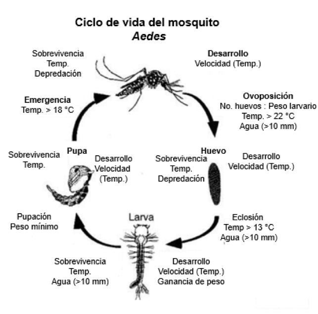 Las hembras ponen huevos, justo por encima del nivel del agua estancada (en neumáticos viejos, macetas, latas, estanques, etc.). Estos, pueden soportar fuera del agua, hasta un año, y reanudan su desarrollo cuando el nivel del agua sube (p. ej. con la lluvia) y los alcanza (Crans, 2004). Después de nacer, la velocidad de desarrollo de larva a adulto dependerá de la temperatura (Crans, 2004; Ciota et al., 2014; Rossi et al., 2014, Rey & Lounibos, 2015). Las hembras adultas suelen picar los tobillos, especialmente al anochecer. Ambas especies transmiten los virus del Zika, Chikungunya, Nilo Occidental (E.G., Chouin-Carneiro, & dos Santos, 2017), y el de la Fiebre Amarilla (Kamgang, et al., 2019), una gran amenaza; pues, aunque en México esta se declaró erradicada en 1963 (Soper, 1967, Cueto, 2005), tras eliminar a su vector Aedes aegypti, la abundancia de este está aumentando.