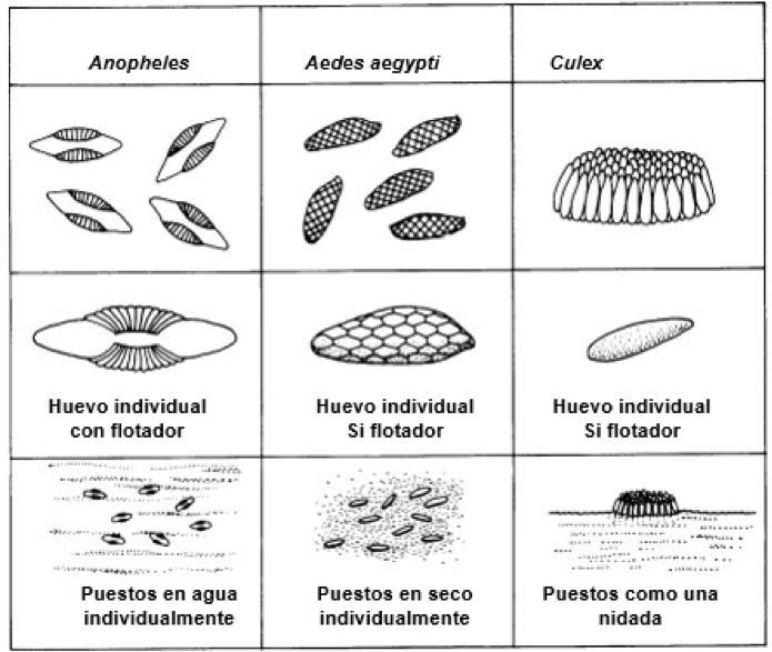 El ciclo de vida de los mosquitos comprende cuatro etapas (Fig. 2): huevo, larva, pupa y adulto (Crans, 2004). Este inicia cuando, después de aparearse y alimentarse de sangre, las hembras grávidas localizan aguas estancadas ricas en nutrientes, donde ponen sus huevos, acorde a la ecología de cada especie (Fig. 3).