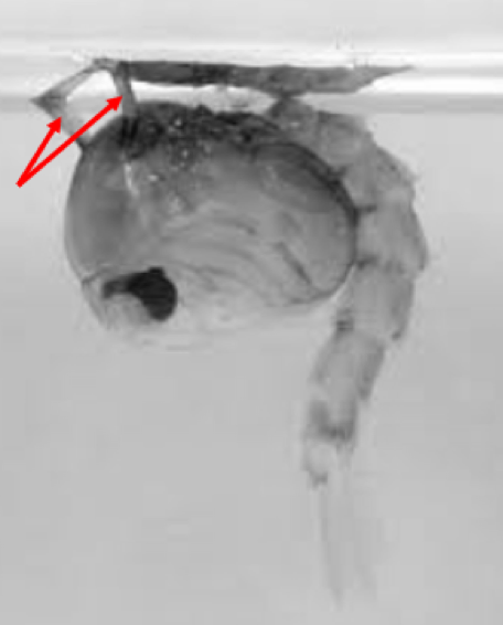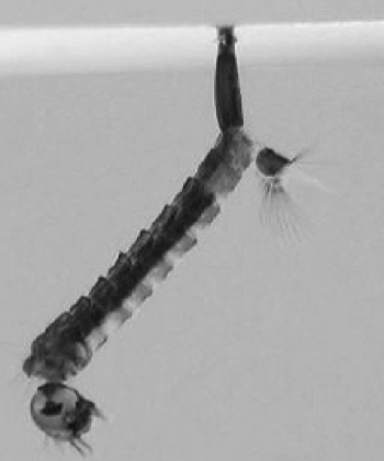 De los huevos nacen larvas que se alimentan de microorganismos o materia orgánica particulada (Crans, 2004). Estas, tienen un tubo en su cola que sobresale del agua, con el que respiran (Fig. 4) (pocas especies de mosquitos tienen larvas que respiran bajo el agua). Después de 2 a 5 días, las larvas se transforman en pupas (distinguibles por sus “trompetas” respiratorias, Fig. 5), las que después de unas 36 horas, se transforman en mosquitos adultos, dependiendo de la temperatura (Ciota et al., 2014; Rossi et al., 2014). Los mosquitos macho se distinguen por sus antenas plumosas (Gibson & Russell, 2006, Fig. 6), con las que localizan hembras. Ambos sexos pueden alimentarse del néctar, pero después de aparearse, las hembras, según su especie, se alimentarán de sangre de una o varias especies de mamíferos y/o aves, para promover la maduración de sus huevos y buscarán agua estancada para ponerlos. Así, el ciclo comienza de nuevo.