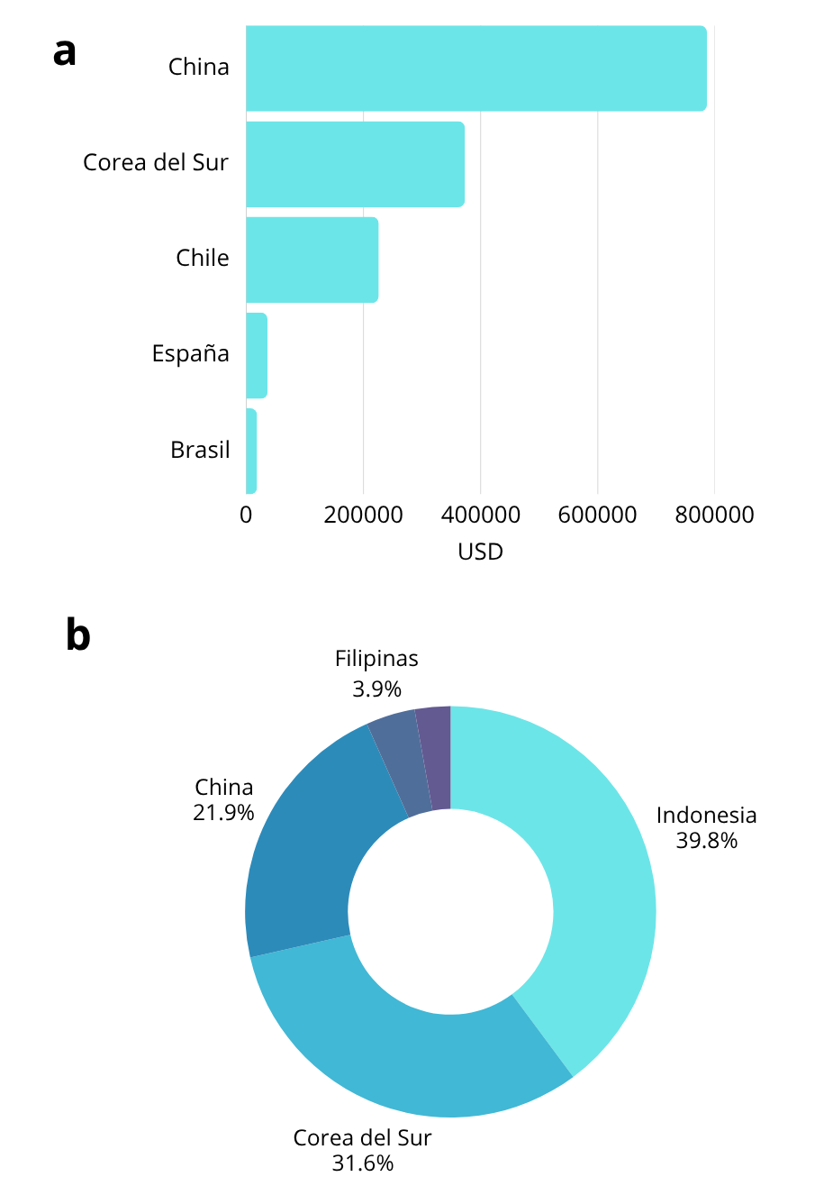 Fig. 1. Comercio internacional de macroalgas. a) Los países con más ventas internacionales de algas marinas a México en 2024. b) Los principales países exportadores de algas marinas a nivel mundial en 2022 en términos de porcentaje.